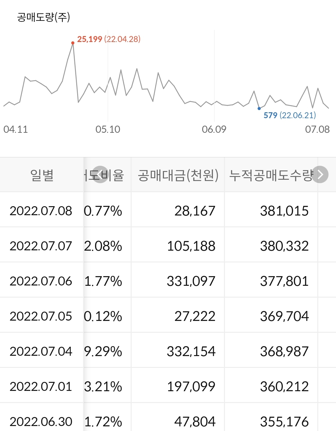 시총 대비 누적 공매도 수급은 거의 없는 수준입니다. 향후 주가 상승에 공매도가 방해가 될 확률은 전혀 없습니다.