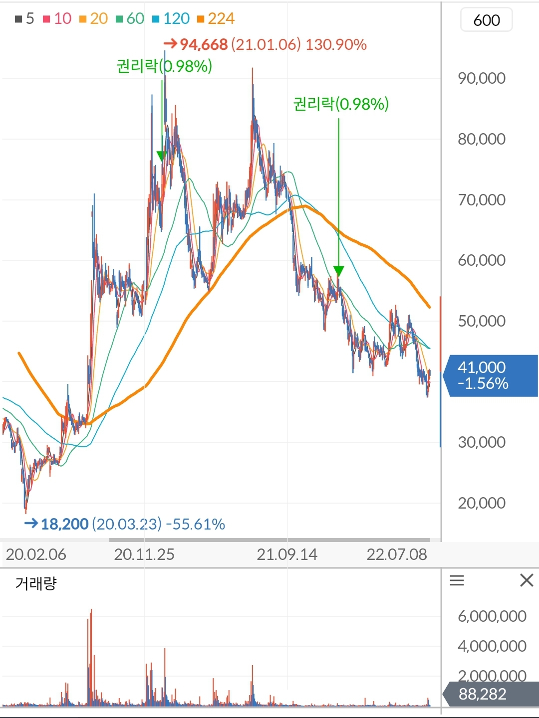 - 테마 소멸 및 연준 고강도 긴축 예고에 따라 글로벌 지수 폭락 ▼ 주가 40,000원대 하락