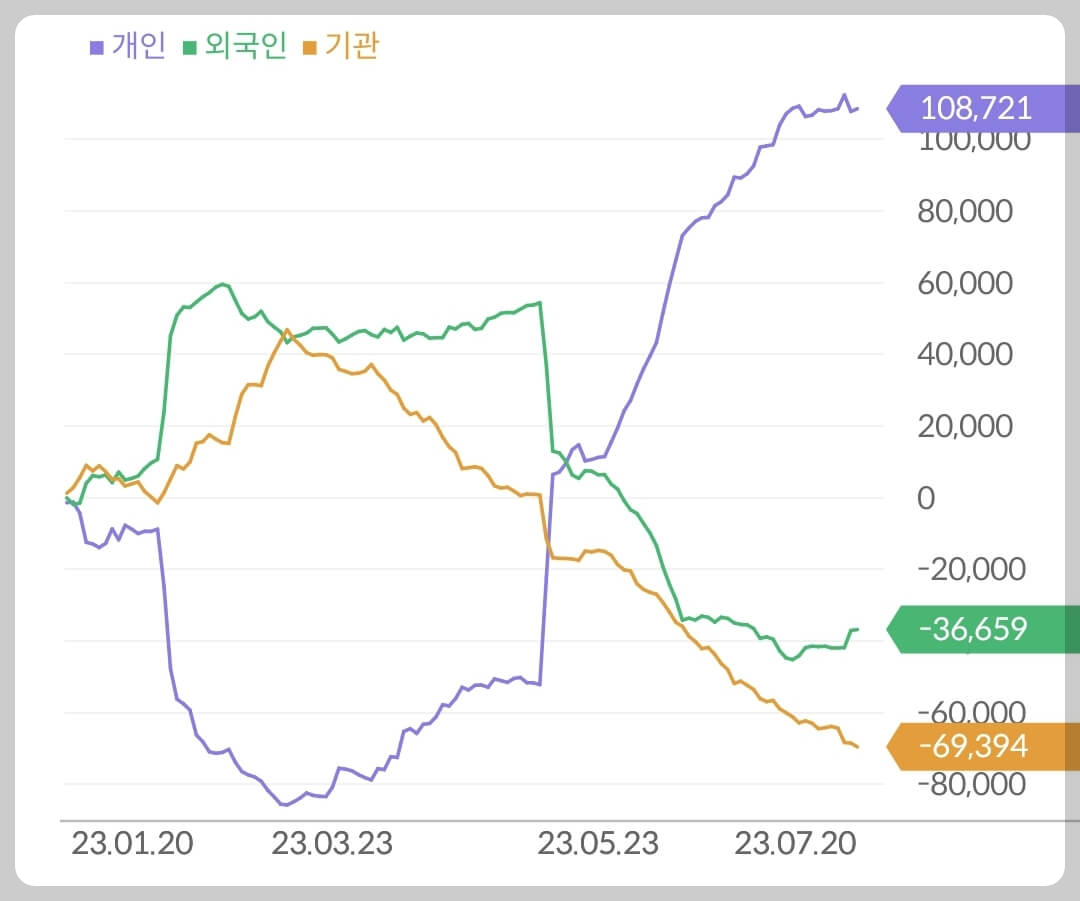 - 개인 1,087억 매수, 외국인 366억 매도, 기관 693억 매도