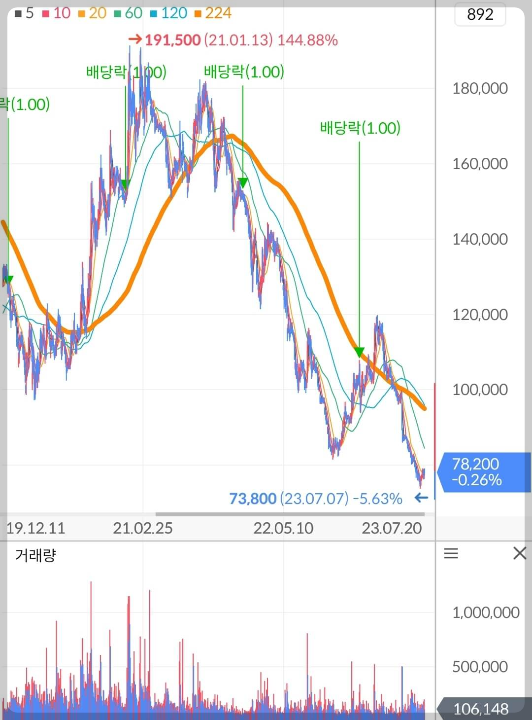 제 글을 꾸준하게 보시는 분들은 이마트를 매수하거나 꾸준히 물을 타서 고생하시는 분들은 없을 겁니다. 224일선이 이렇게 가파르게 하락하고 있고 추세 전환의 의지가 전혀 보이지 않는 차트에서 매수하면 안 된다고 말씀드렸고, 이런 차트에서는 물리면 물을 타는 게 아니라 잘라내야 된다고 말씀드렸습니다. 하락하는 대형주(우량주)에서 어떻게 매매해야 하는지 궁금하신 분들은 아래 링크를 통해 숙지하시길 바라겠습니다.