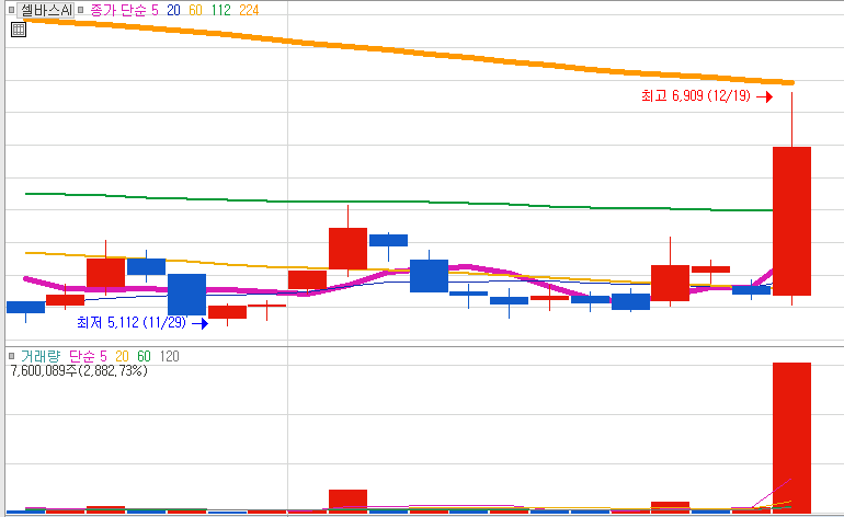 이전과 비교할 수 없을정도로 대량 거래량이 터졌고 장대양봉이 만들어졌습니다. 이렇게 장대양봉이 나왔다면 절대로 장중에 매수하시면 안됩니다. 장중에 매수하셨다가 윗꼬리가 크게 달리거나 상승분을 모두 반납할경우 엄청난 손실을 기록할 수도 있습니다. 손익비가 좋은 타점이 올때까지 기다리시는게 눌림목 매수 기법의 핵심입니다.