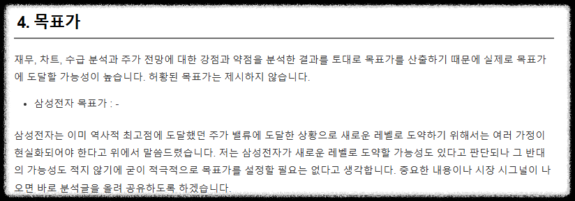 이전 분석과 마찬가지로 삼성전자 목표가는 생략합니다. 자세한 이유는 위에 설명드렸으니 참고하시고 새로운 모멘텀 및 패턴, 시그널이 발생되면 다시 분석을 통해 공유드리도록 하겠습니다.