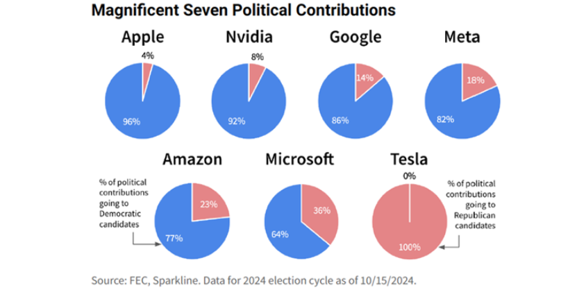 애플, 엔비디아, 구글, 메타, 아마존, 마이크로소프트 모두 패배한 민주당에 더 많은 후원금을 납부했죠. 테슬라는 100% 공화당에 올인했고 이런 그의 승부사 기질은 주주들에게 폭발적인 수익으로 돌아왔습니다.