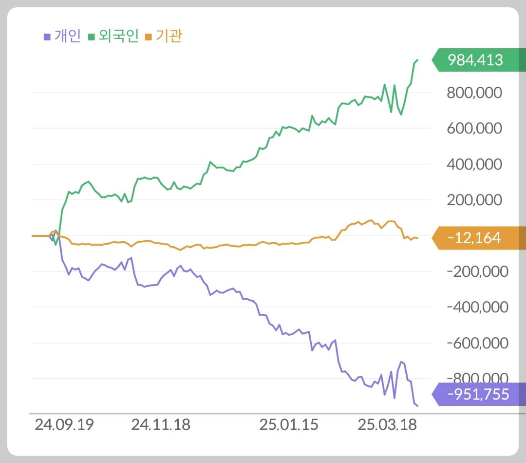 외국인 투자자들이 가장 중요시하는게 매크로라고 말씀드렸습니다. 한화에어로스페이스에서도 최근 반 년도 안되어 지분을 추가로 10% 매집하며 지금의 상승세를 홀로 주도했습니다. 개인 투자자들은 폭발적인 주가 상승과 수익에 물량을 처분하며 수익을 챙기고 있습니다.
